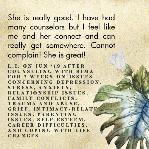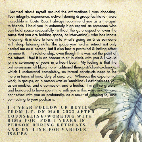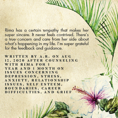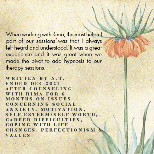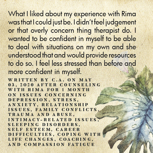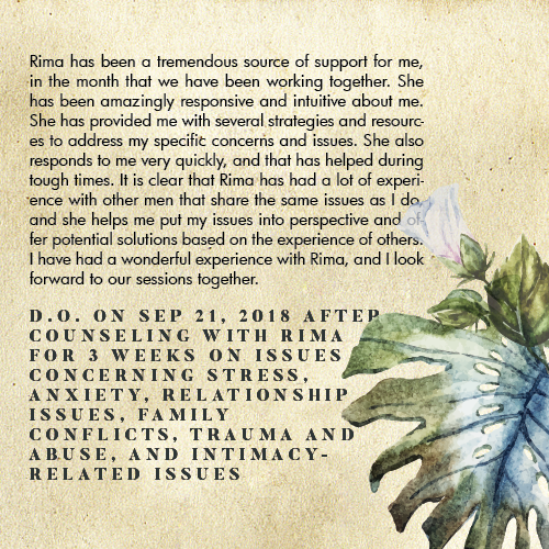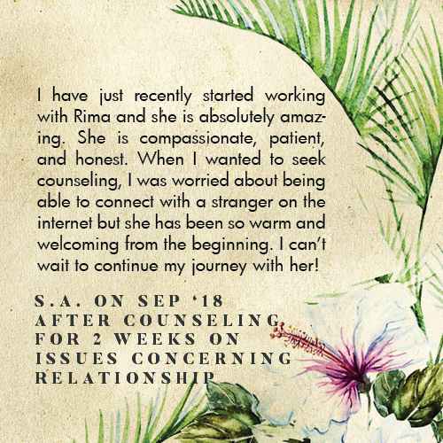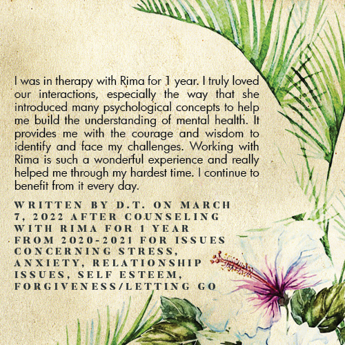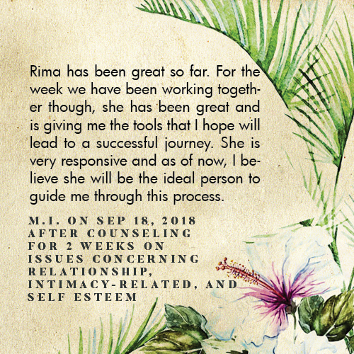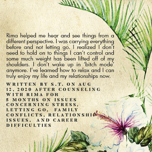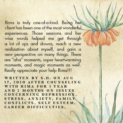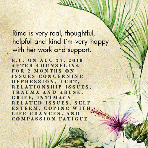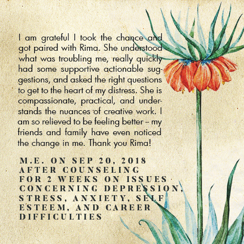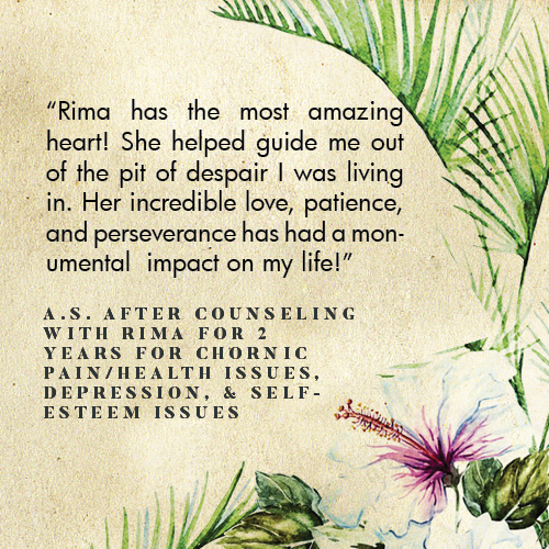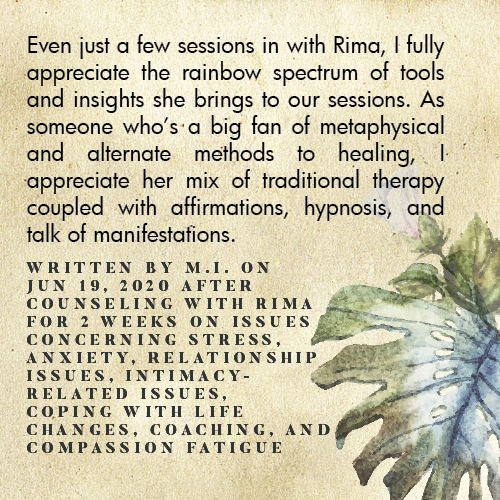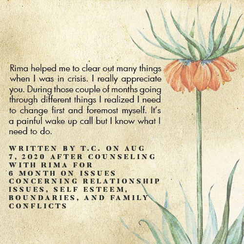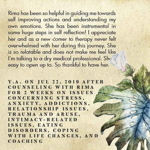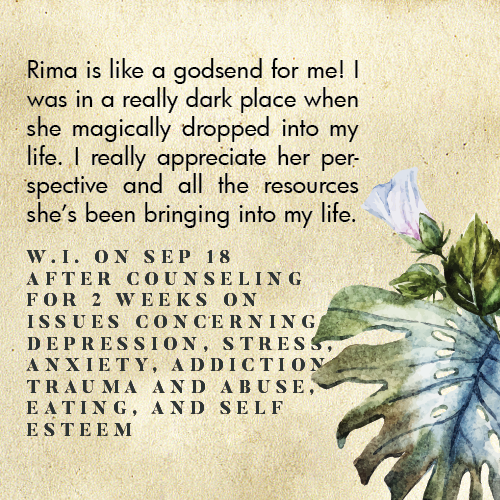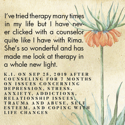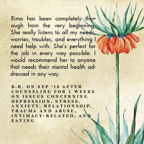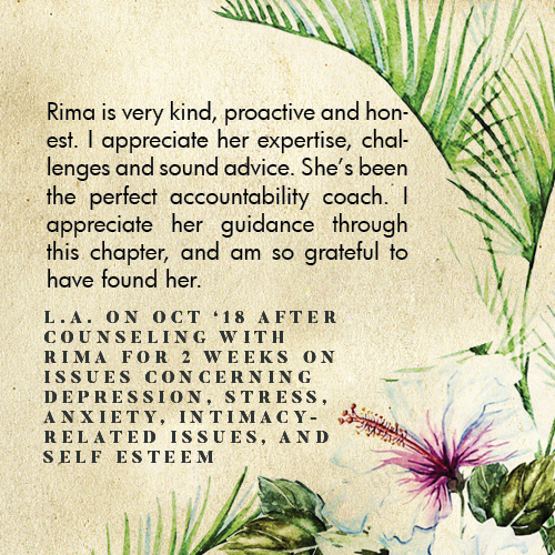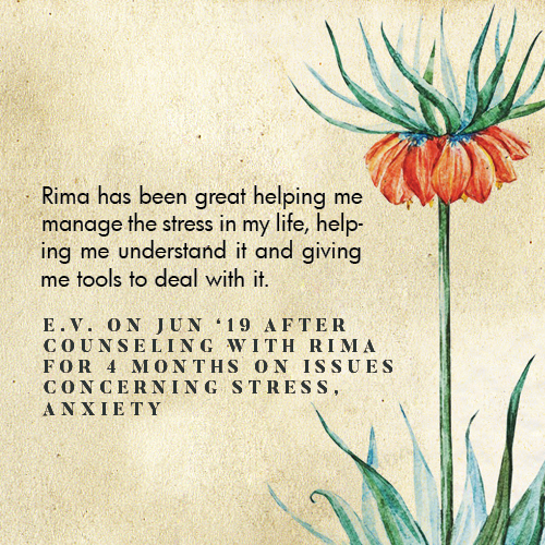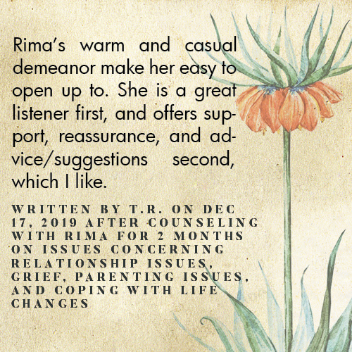 * Rima is licensed in the State of California - LMFT #82229 - and can only legally work with clients that physically reside in California or with international clients who’s laws permit it.