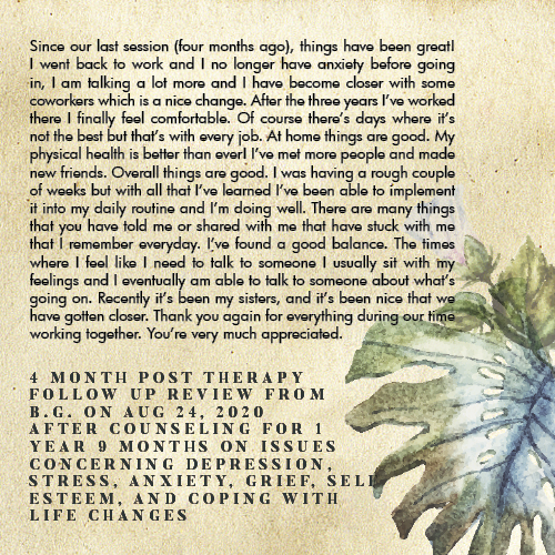 I have a 100% VIRTUAL psychotherapy practice (aka telehealth or teletherapy). I’ve worked online since 2018. Due to COVID-19 concerns and the rapidly changing landscape we live in, teletherapy is becoming the NORM versus a “last resort” option. This makes me an EXPERT in telehealth. I have experience in leveraging the challenges of telehealth and capitalizing on the benefits so you won’t feel like you’re compromising a thing. Read my reviews below to see what clients say!