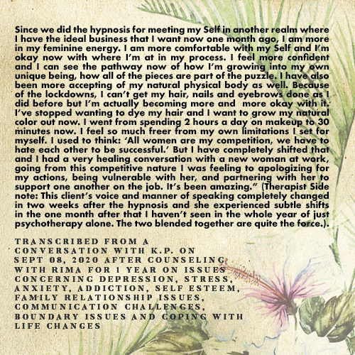 My clients enjoy the warm rapport they have with me. I approach each client from a unique perspective as each client is unique. I collaborate with them to understand their needs and goals, and from there I create a treatment plan that is special for them. I believe that each client has a story that can be retold in a new way, and a story that is still being written, so the middle and ending can change as the client transforms.
